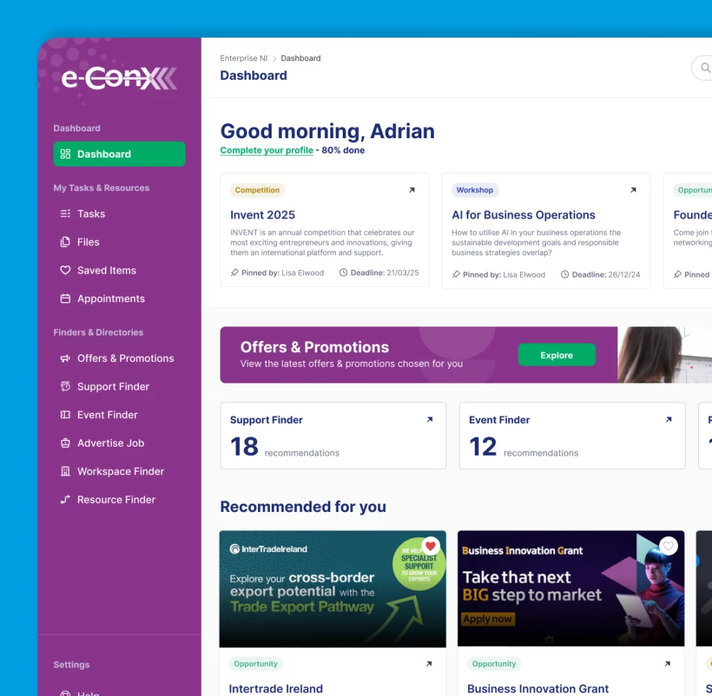These issues underscored the need for a unified, modern solution to empower entrepreneurs and streamline their service delivery operations. Partnering with Startium, ENI launched eConX, a fully-bespoke, Northern Ireland specific, software platform designed to transform the delivery of entrepreneurial support across NI.